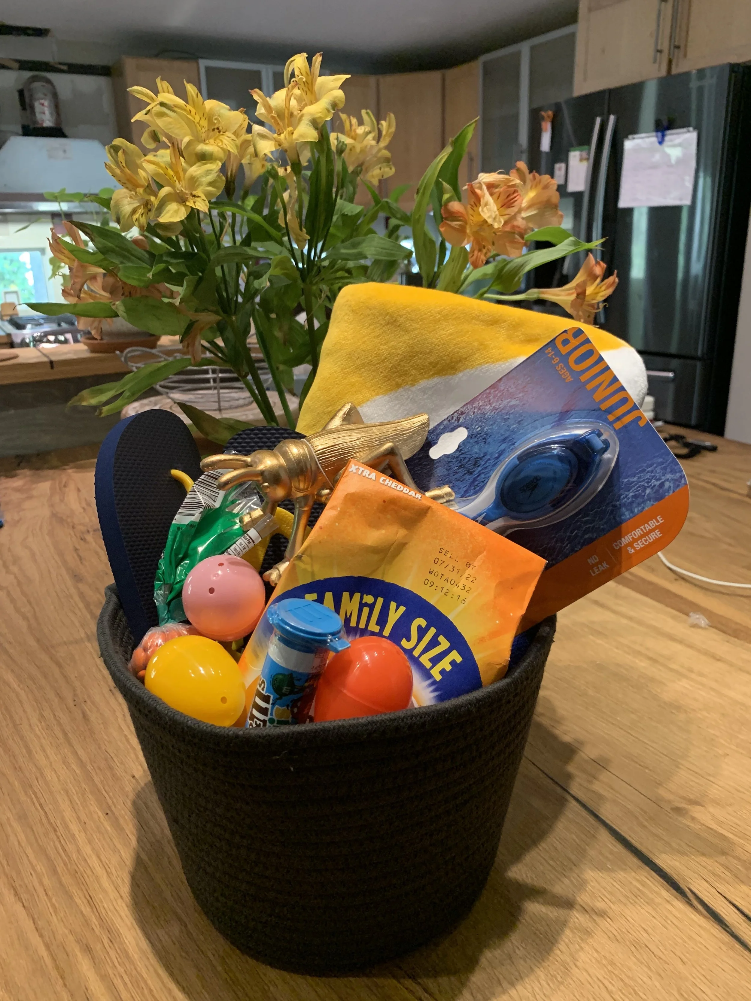Ezra’s basket containing a new beach towel, flip flops, goggles, a golden Jimminy Cricket, candy, and goldfish. The consumables will be gone within the week and the others have a purpose and a place. Everyone WINS.